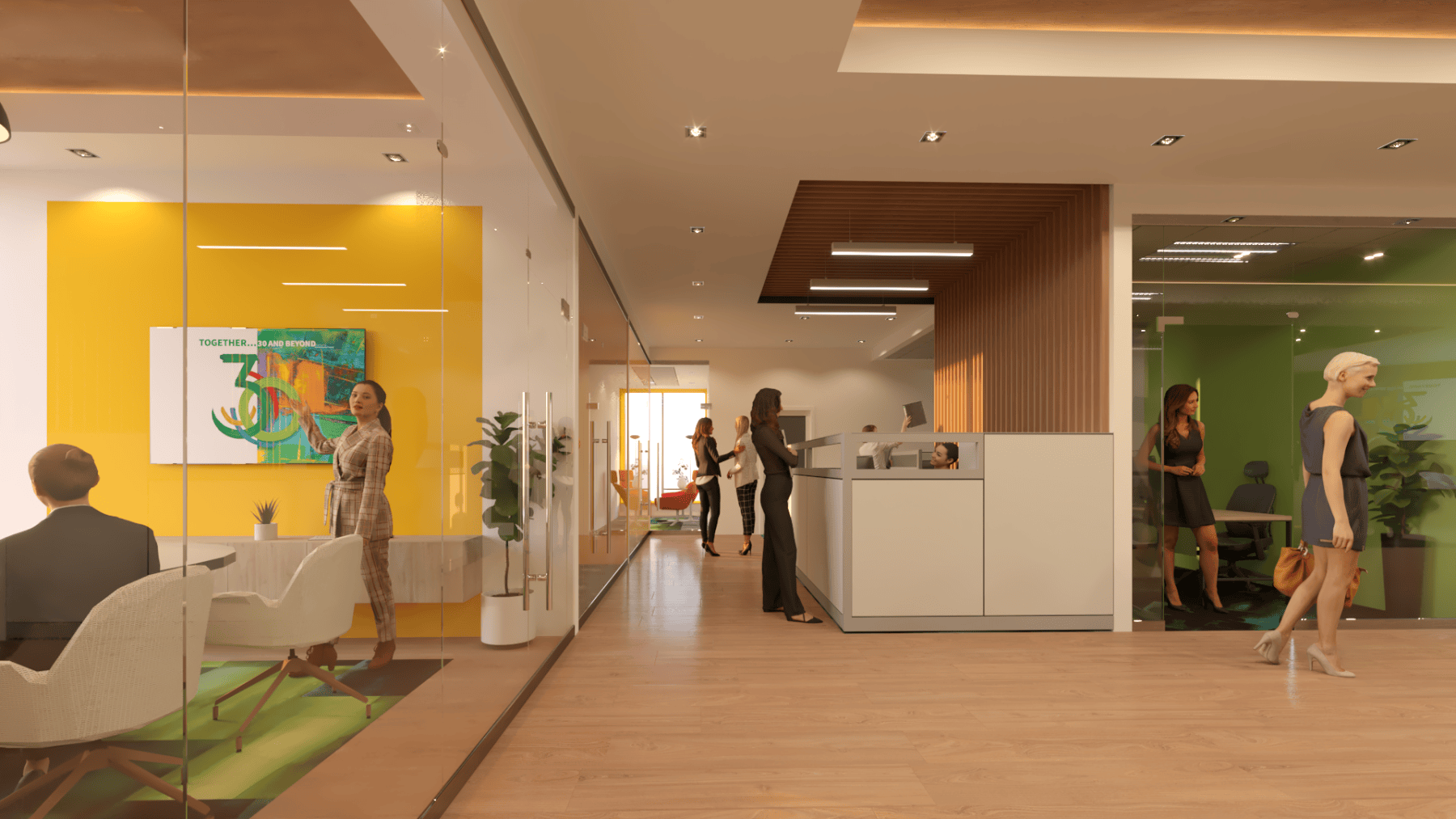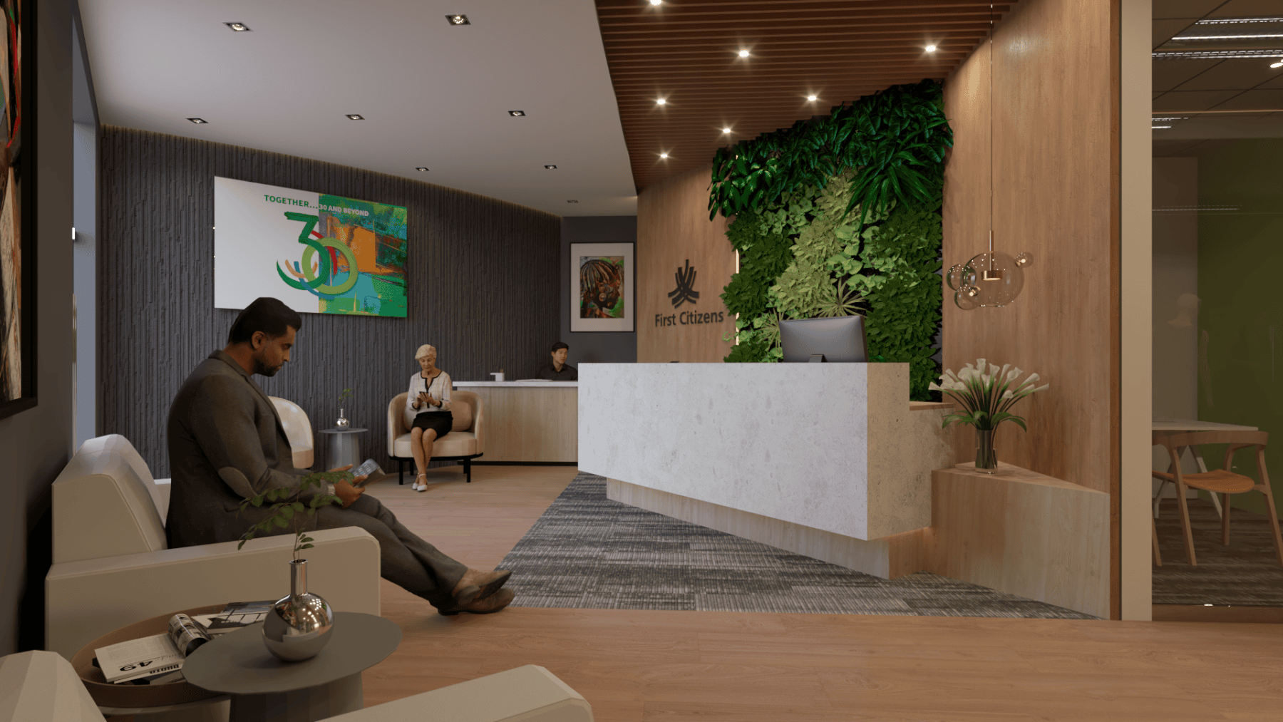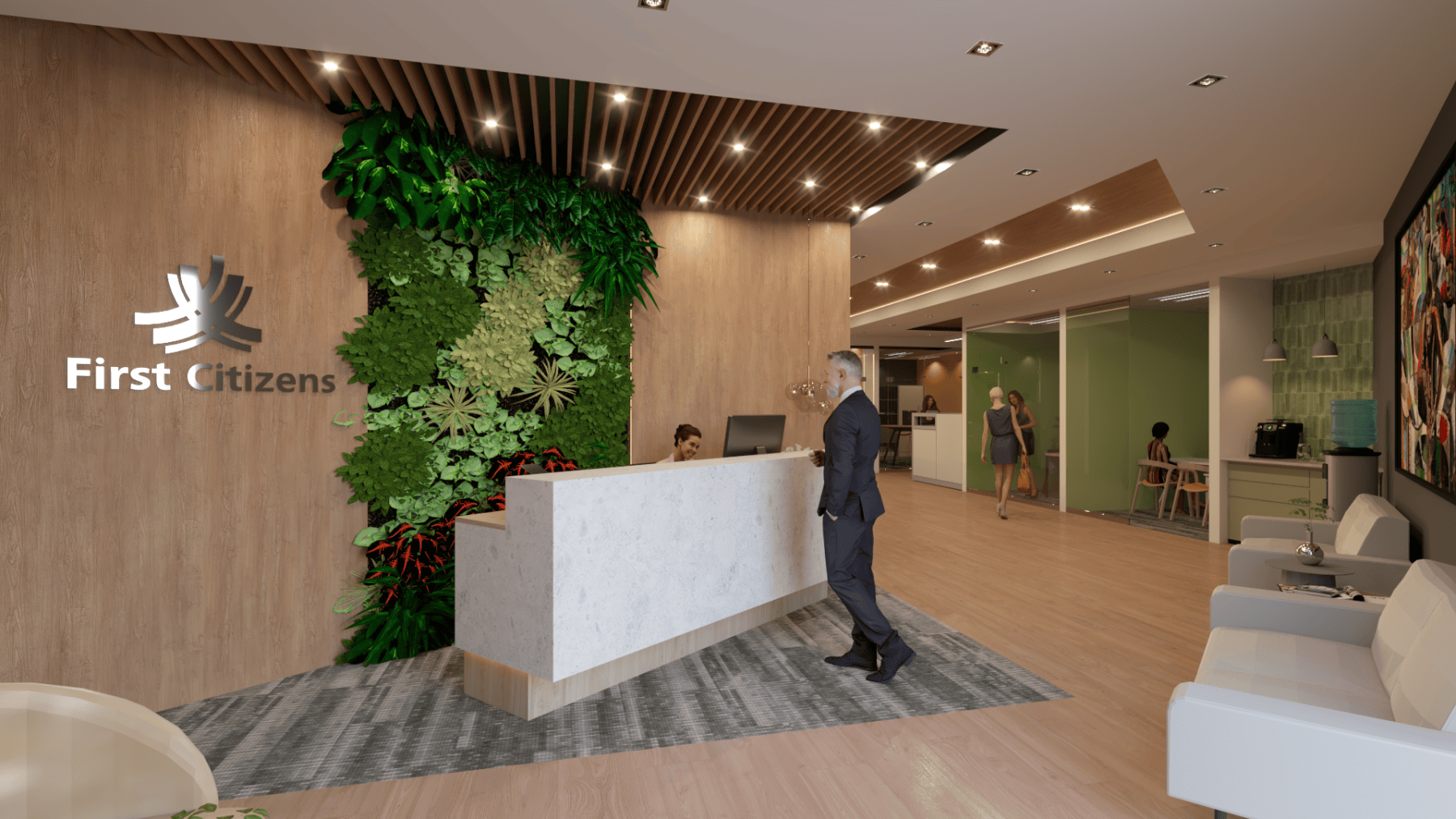For this interior fit-out for First Citizens Investment Services, ACLA was tasked with outfitting a full service brokerage house that offers investment products in a sophisticated but warm and inviting environment. The design palette utilised the FCB brand combined with natural elements to introduce moments of biophilia by using faux moss, wood and stone textures. All combined with warm accent lighting throughout to encourage a humane yet refined space that promoted efficiency and comfort among staff and clients.